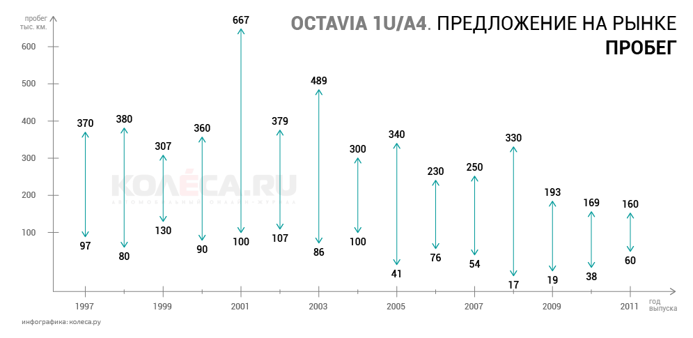 В общем, надо признать первую Октавию одной из наиболее удачных машин этой марки с точки зрения затрат на эксплуатацию – не зря она так долго продержалась в производстве. Навряд ли заменившая ее Skoda Rapid будет столь же долговечна и дешева в эксплуатации. Наиболее оптимальным силовым агрегатом для машины является мотор 1,6 мощностью 102 л.с. поздних выпусков и механическая коробка. Каких-то опций, снижающих надежность, на машине просто не существует, а значит, вопрос только в состоянии конкретного экземпляра. К сожалению, солидная их часть были разъездными или даже работали в такси – ресурс может быть исчерпан на все 200%. Помните про то, что кузов тут требует внимания, оцинковка со временем «сходит на нет», если краска уже отошла. А несвоевременные ремонты повреждают цинковый слой на всех прилегающих панелях. И, конечно же, по нынешним меркам это машина вовсе не С-класса, а, скорее, В+, и поздние экземпляры оказываются неоправданно дороги в сравнении с Kia Rio и VW Polo Sedan, учтите и это.