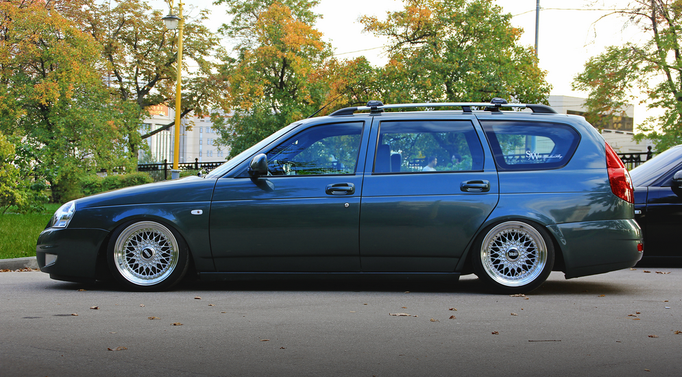Впрочем, клиренс Приоры из Дагестана всё равно ниже на пару сантиметров – узкие колёса не мешают кузову ложиться на асфальт. Для большего занижения владелец «стенс»-Приоры планирует перейти на диски диаметром 15 дюймов. Впрочем, одно сходство всё же есть – передний бампер на универсале также заменён на рестайлинговый.