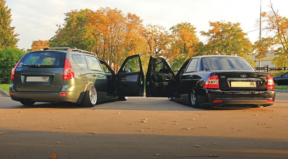 Место встречи было выбрано не случайно – территория Московского государственного университета последние несколько лет является Меккой для любителей нестандартных машин. И именно здесь несколькими днями ранее я познакомился с Мансуром – владельцем чёрного седана 2012 года выпуска. Предварительные поиски Приоры «южного» стиля по интернету успехом не увенчались – большинство машин находились за тысячи километров, поэтому было решено отправиться на смотровую площадку Воробьёвых гор. Со вторым владельцем я оказался знаком лично: Петя практически одновременно со мной начал постройку своего универсала в стиле stance. Год выпуска его Приоры – также 2012. Теперь, когда два одинаково-разных автомобиля стоят передо мной, можно перейти к их детальному сравнению.