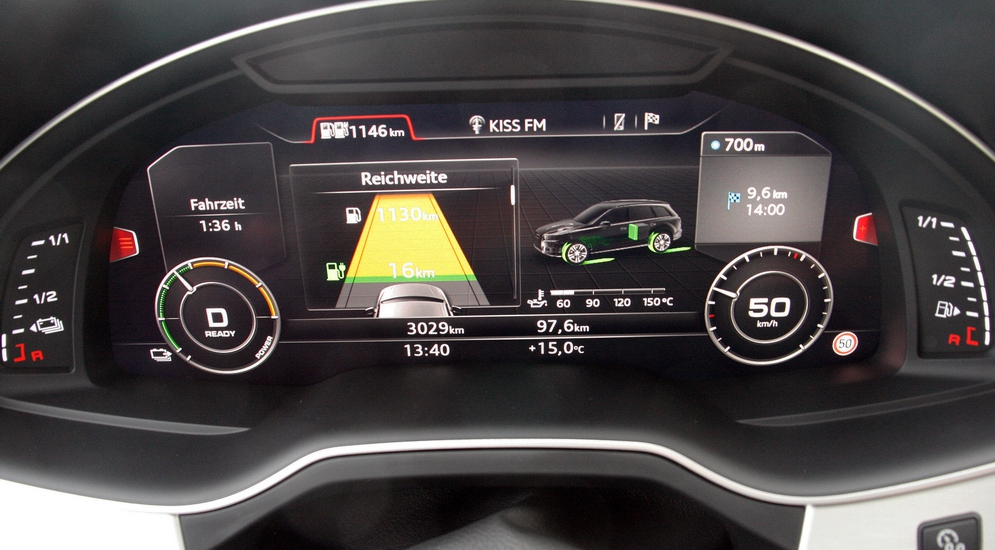 В стандартном же исполнении, доступном нам, динамиков всего девять, зато уже есть русифицированная навигация с 12,3-дюймовым дисплеем, а также внушительный внедорожный арсенал, включающий в себя систему Multi-terrain Select, «ползучую» регулировку скорости Crawl Control и функцию Turn Assist, позволяющую развернуться практически на месте. А после обновления к этому списку добавилась система видеокамер Multi-terrain Monitor, способная даже заглянуть под днище машины.