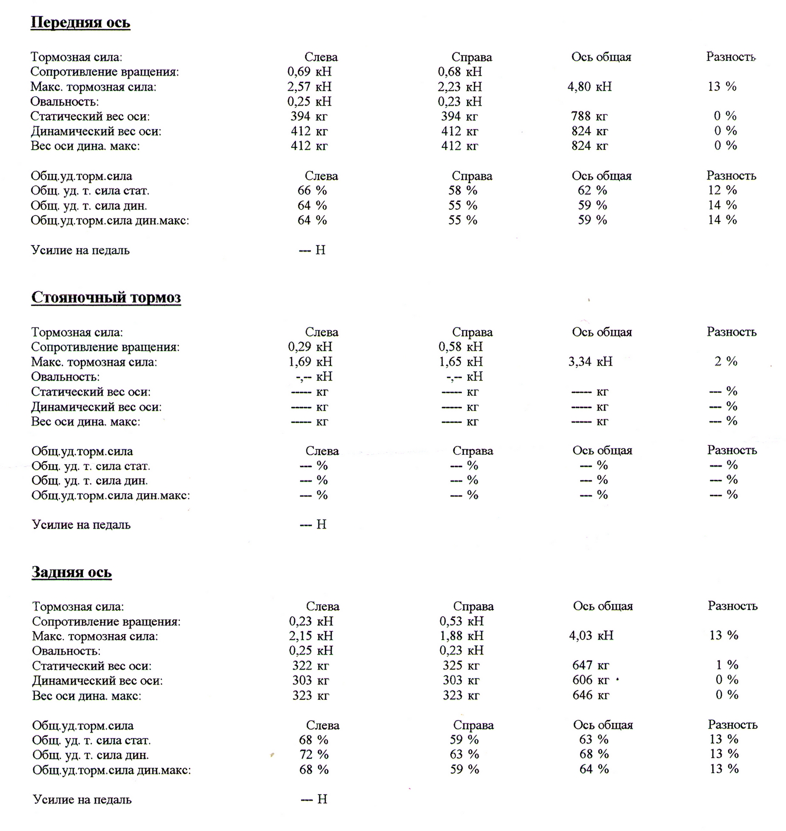 В общем-то, разница между правой и левой сторонами невелика. Можно даже техосмотр пройти, если надо. Но она есть, причём обратим внимание: и спереди, и сзади разбег между величиной тормозной силы отличается на 13%. Причём справа она в обеих случаях меньше. Напомню: там стоят колодки из коробки с надписью EGT.