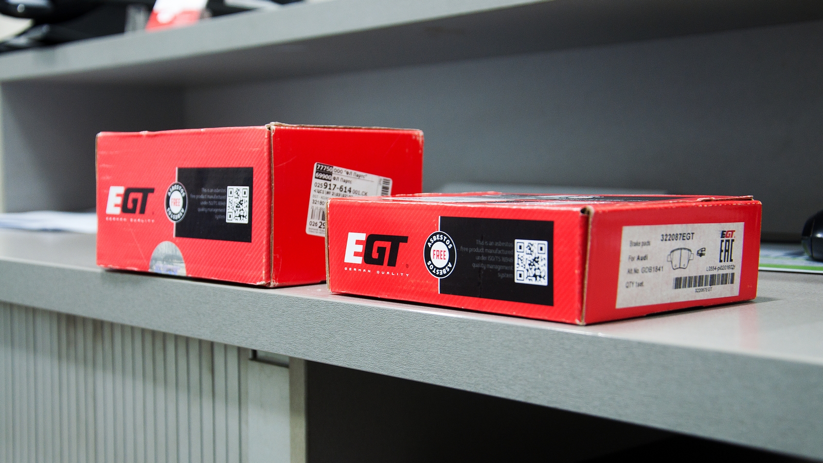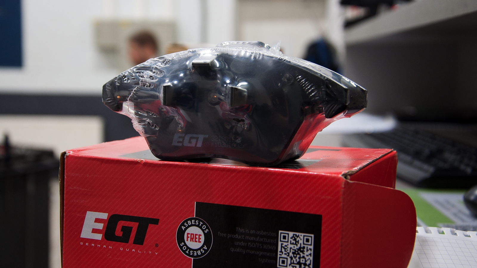Со вторым комплектом получилось сложнее. Дело в том, что «совсем китайские» колодки купить комплектом никак не получалось – одни делают только передние колодки, другие – только задние. Такая же ситуация с отечественными деталями, поэтому мы остановились на продукции EGT. Что это за фирма, спросят некоторые? EGT (European General Technologies) – это литовская компания, которая продаёт под своим брендом запчасти 70 000 различных производителей, причём – высшего качества. Постараемся быть непредвзятыми и поверим в то, что говорит эта компания про себя любимую на своём же сайте. По большому счёту, выяснять, что лежит в коробках с тремя чуждыми русскому духу буквами, невозможно. Да и на самих колодках написаны те же самые три буквы. Судя по цене в три с половиной тысячи за комплект, вряд ли там упаковано что-то слишком хорошее. Но всё же посмотрим – а вдруг?