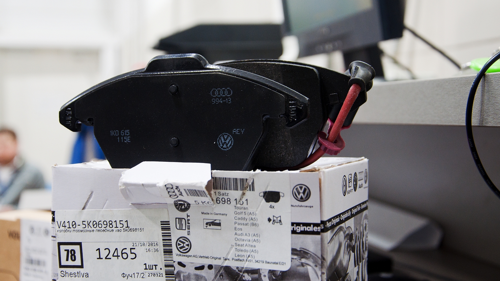 Итак, наша первая задача – выбрать испытуемые колодки. Как обстоят дела с оригинальными колодками? Их мы заказывали по оригинальному же каталогу согласно VIN-коду автомобиля. И что же нам пришло? На коробках, разумеется, написано просто Volkswagen (иногда – Volkswagen Group), и чтоб окончательно добить – Made in Germany. На задних (их артикул 5K0 698 451 A, по каталогу) есть более конкретная надпись – Bosch. Передние колодки по артикулу (5K0 698 151) так и остались под именем Volkswagen. За весь комплект отдали ровно 10 000 рублей (и это – с учётом скидки).