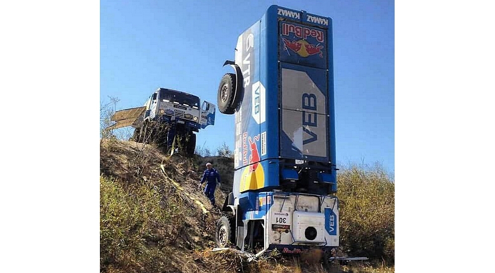 Разумеется, во всех новостных лентах главная фотография – это КАМАЗ Дмитрия Сотникова, стоящий на переднем бампере. Сюрреалистическая картина – наверное, главный кадр сезона. Как так получилось? А дело в том, что при всем нашем всеобщем уважении к команде «КАМАЗ-мастер» воспитанники Владимира Чагина очень любят ломиться «по азимуту», срезая трассу где только можно. И такая тактика оправдывает себя далеко не всегда. На гонке «Великая степь/Шелковый путь – 2015» в такой же ситуации КАМАЗ Эдуарда Николаева «поймал» колесом яму, сам Николаев получил травму и вынужден был сойти с гонки. А в этот раз все было еще фееричнее: многотонная махина, перемахнув очередной бархан, практически вертикально вошла в песок и встала на бампер. Самое интересное, что машина застыла в таком положении и не собиралась его менять даже после того, как экипаж покинул кабину. На помощь подоспели партнеры по команде – экипаж Антона Шибалова, и только совместными усилиями спортсменам удалось поставить грузовик на колеса. Оба экипажа продолжили гонку.