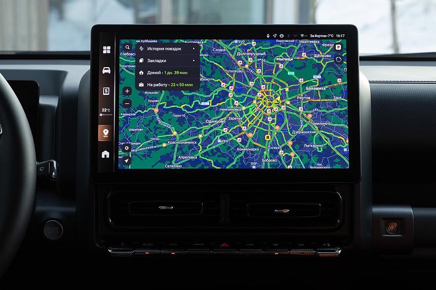 Во-первых, в штатную мультимедийную систему интегрирована платформа онлайн-сервисов Яндекс Авто с доступом к Яндекс Картам, Яндекс Музыке и Яндекс Книгам. Все сервисы синхронизируются через Яндекс ID, так что можно проложить сложный маршрут на домашнем компьютере, завести машину и просто отправиться в путь. При этом маршрут будет корректироваться с учетом актуальной ситуации на дорогах, и для этого не потребуется интеграция со смартфоном: Яндекс Карты умеют прокладывать оптимальный маршрут через пробки, информировать водителя о камерах, произошедших ДТП, ремонтах и тому подобных дорожных событиях. А в местах, где нет покрытия мобильной сети, могут работать в оффлайн-режиме. Еще один приятный бонус – карту с маршрутом и подсказками можно вывести на приборный экран. Карту, которая выводится на главный тачскрин со смартфона через пакеты интеграции, вывести на приборную панель не получится.