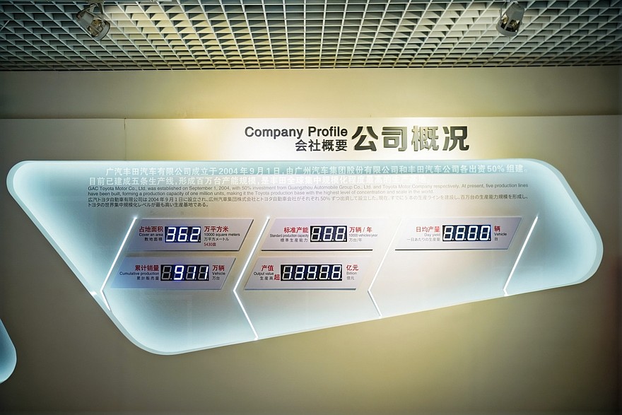 Завод GAC Toyota открыт в 2004 году. Площадь предприятия – 3,62 млн квадратных метров, из них 1,35 млн – производственные корпуса. На пяти линиях завода работает около 15 000 сотрудников. Максимальная производительность фабрики достигает миллиона автомобилей в год – это крупнейшее в мире сборочное предприятие Toyota.