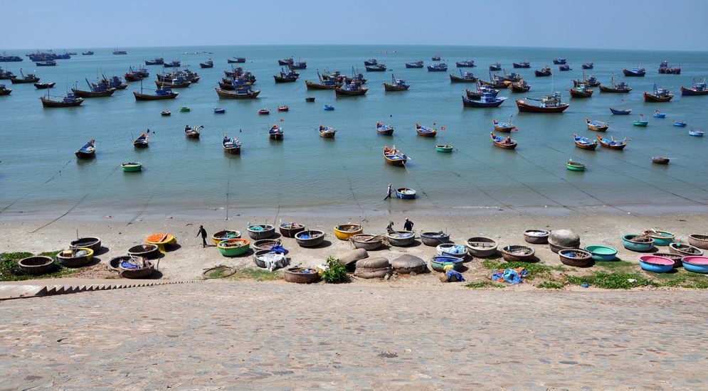 Вдоль берега в Муйне, как на воде, так и на суше, вы увидите множество круглых лодок – это национальные «тхунг чай». Традиционно такие лодки-корзины плетутся из бамбуковых прутьев, обмазанных смолой, а сейчас выпускаются и пластиковые варианты. Вьетнамские рыбаки используют их как средство передвижения от основной лодки до берега и обратно и между большими лодками, ну а для туриста это – захватывающий аттракцион. Кстати, только здесь, в Муйне, мы наконец-то встретили вьетнамцев в конусообразных шляпах.