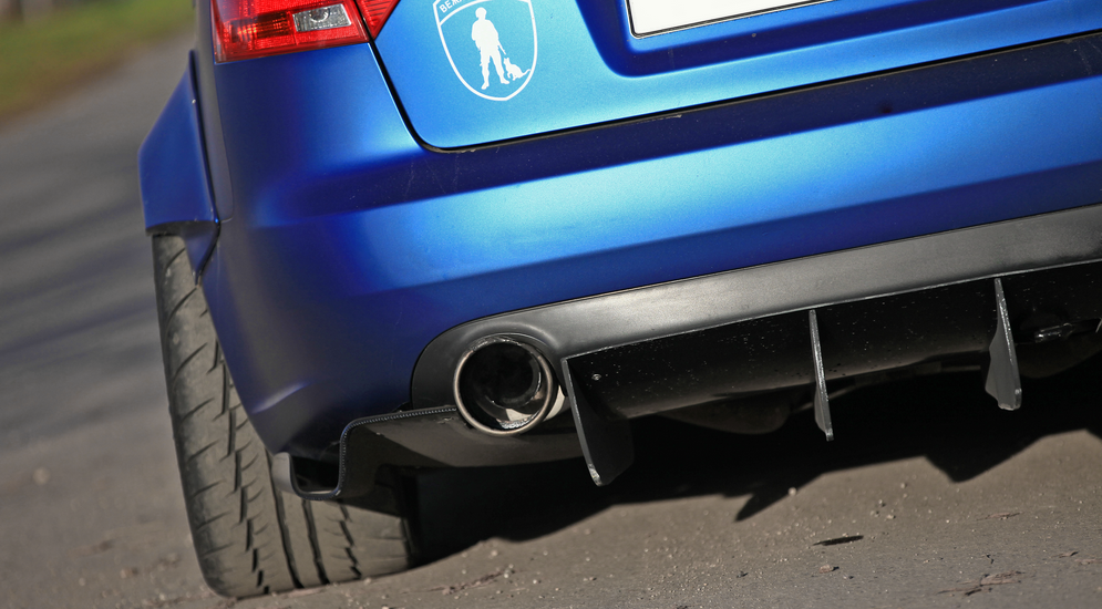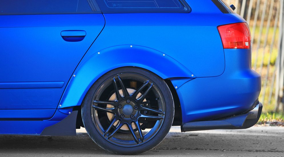 Изначально ему ну очень не нравился внешний вид штатного бампера, а цены на варианты S-line и DTM мало того, что «кусаются», так еще и выдающейся оригинальностью не отличаются. Так что первым делом он изготовил для Ауди переднюю губу со сплиттером и пороги. Далее, под новые «жирные» колеса были созданы фендеры (расширители арок) из ПВХ, а затем облик дополнил и задний диффузор. Правда, в итоге передние аэродинамические элементы, уже после покупки машины Артемом, переделывались раз шесть.