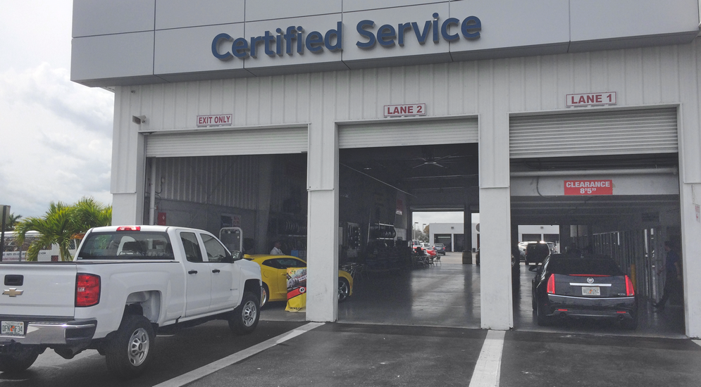 Таким образом, на момент поездки в сервис у меня было две задачи: поменять масло и устранить две вышеуказанные проблемы. С ними я и приехал в автосалон Miami Lakes Automall Kia, где покупал машину. Там мне сообщили, что единый авторизованный сервис находится при въезде на территорию дилерского комплекса. Вернувшись на пару сотен метров назад, я увидел большой ангар.