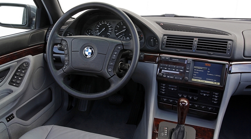 Внутри – рай для водителя и пассажиров, на оформление салона уходят целые рощи деревьев ценных пород и стада коров. Разумеется, уже в базе тут весьма «бохато», а на заказ возможно было все – от раздельных задних сидений со шторками и музыкой Nakamishi до чейнджеров, сотового телефона, навигационных систем с цветным дисплеем и телевизора. Впервые тут появились система контроля BMW Assist и «занавески безопасности», служащие для предотвращения травмирования головы при боковом ударе и перевороте.