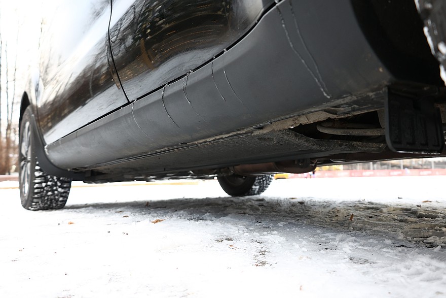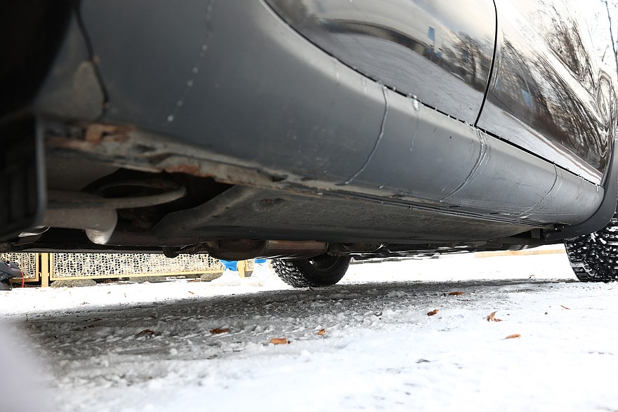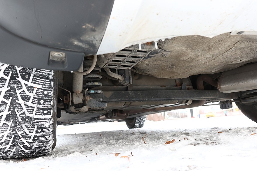 Конструкция кузова немного необычна: порог довольно высокий, а все днище закрыто двумя сплошными панелями, за которыми не видно ничего, даже если смотреть с помощью зеркальца или камеры смартфона. Хорошо заметно только, что ржавеет передний подрамник и есть немного коррозии под нишей багажника.