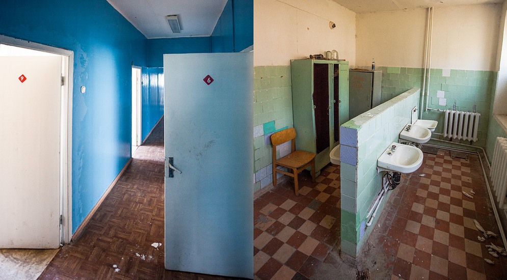 Жилой комплекс также закрыт, но в него пробраться как раз можно. Есть открытая дверь в подвальное помещение, которое представляет из себя множество комнат с обшарпанными стенами и капающим с потолка конденсатом. Тут нечего делать, если не взять с собой фонарик. На жилых этажах корпуса мало что осталось: несколько коек, пара стульев, да доска для стенгазеты.