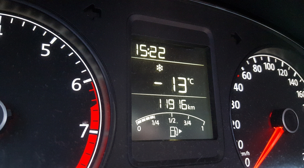 На улице минус 13, автомобиль VW Polo, двигатель 1,6, бензин, масло – синтетика. Первая попытка пуска не получилась – неудачно подключили плюсовую клемму, площадь контакта была мала, стартеру не хватало тока. Пошевелим «крокодилы», добиваясь плотного зажима, и делаем пять запусков подряд без аккумулятора вообще – стартер крутит, двигатель запускается! На бустере после такого издевательства остается 50% заряда!