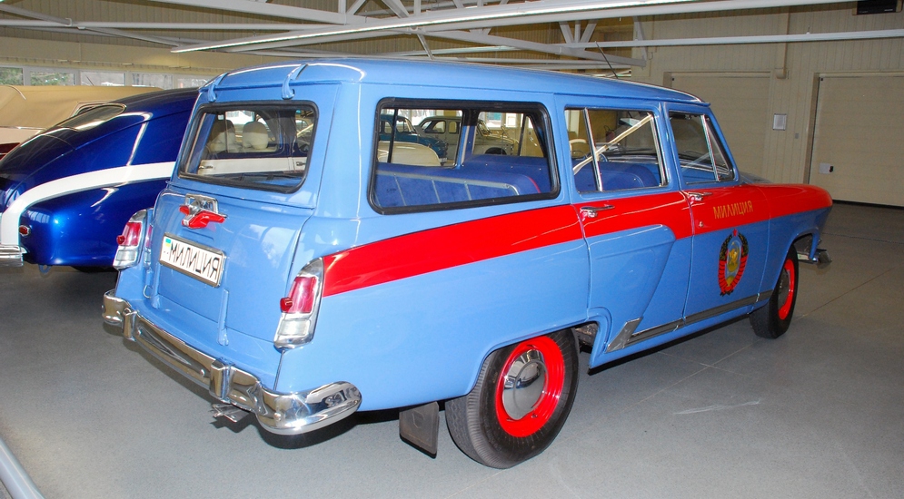 ГАЗ-22 – это один из немногих серийных советских автомобилей с кузовом «универсал». Автомобиль производился с 1962 по 1970 год. Семиместный универсал «добирался» до конвейера более шести лет. Интересно, что для ГАЗ-22 не делали специальных штампов боковин – их делали из стандартной боковины от седана, приваривая верхнюю часть. Пятидверные «Волги» никогда не продавались в розницу, они доставались лишь предприятиям. В экспозиции выставлена спорная версия универсала: на машине установлена решетка радиатора от ранней версии 21-ой, с которыми универсалы никогда не выпускались. Также и окраска милицейского авто взята из ГОСТа, действовавшего до 1958 г., который ГАЗ-22 не застал. Но о настоящем милицейском прошлом машины говорит особой формы заглушка по центру торпедо на месте штатного радиоприемника – спецмашины «музыкой» не комплектовались.