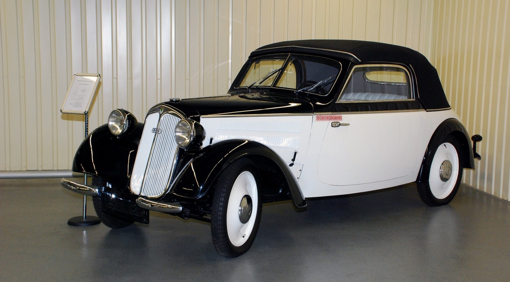 Переднеприводный DKW F8 – это компактный автомобиль, производство которого наладили на заводах «Ауди» и «Хорьх» в городе Цвиккау в 1939 году. После войны массовые малолитражки целыми партиями отправлялись в Союз. В Ленинграде трофейными DKW укомплектовали даже целый таксопарк – Первый Ленинградский. «Восьмерка» построена на интегрированной в днище раме грушевидной формы, которая чуть позднее легла в конструкцию восточногерманских «Вартбургов». Несмотря на нетехнологичный деревянный кузов, обшитый фанерой (из металла в облицовке делали только оперение капота, щиток приборов и решетку радиатора), немцам удавалось выпускать до 60 000 машин в год. Кабриолет DKW F8 в люксовом исполнении со всеми металлическими деталями кузова, украшающий коллекцию украинского президента, восстановлен реставрационной фабрикой «Самоходъ» из города Краматорск.