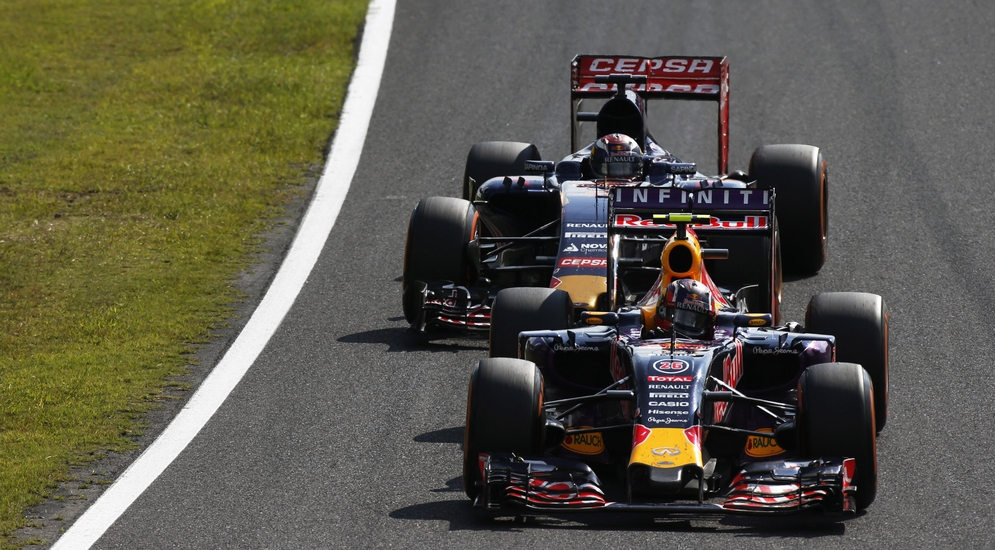 Старт, как и полагается на Сузуке, выдался очень ярким. Росберг его привычно проиграл, до кучи оказавшись на неудобной траектории, которая привела его за пределы трассы и заставила пропустить вперед не только Хэмильтона, но и Феттеля с Боттасом. Вообще, первый поворот на Сузуке очень длинный, такой что порой и не поймешь, где первый, а где второй уже. Именно это, может быть, и превращает стартовую процедуру в веселую карусель. Пока Хэмильтон с Росбергом в первом повороте выясняли, кому из них финишировать первым, в середине пелетона произошло несколько нежных любовных касаний. Первыми, еще до поворота, потрогали друг друга Масса и Риккьярдо, после чего на болиде Williams отвалился нос, попутно пробив колесо, а Red Bull лишился задней левой покрышки и шансов хоть на какие то очки. Парой секунд позже Сайнц даст легкого волшебного пендаля Пересу и отправит его окучивать японскую картошку в окрестностях все того же первого поворота.