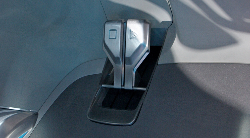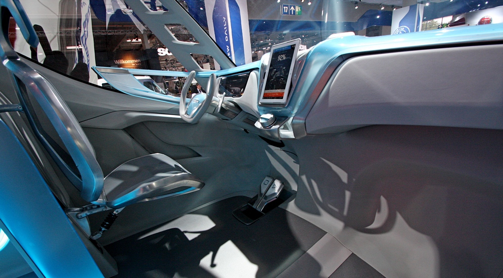 Оно весьма неординарно. Водительское сиденье крепится к задней стенке и снабжено собственным амортизатором (на выставочном экземпляре он был от подвески горного велосипеда), вместо руля – штурвал (прямая отсылка к дизайнерским идеям 50-х годов прошлого века) с лопастями подрулевых переключателей. Вместо привычной – электронная приборная панель и многоцелевой съемный планшет, без которого не обойтись в современном концепт-вэне.