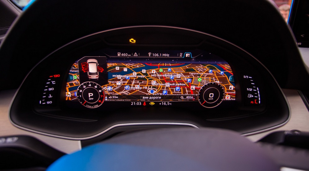 Второй такой характеристикой можно смело назвать приборную панель, представляющую собой единый экран высокого разрешения, для которого впридачу заявлена частота 60 кадров в секунду. Да-да, практически «HD в 60 fps»: хочешь – фильмы смотри, хочешь – в игры играй. Правда, ни первое, ни второе на приборной панели сделать не получится, зато, например, любоваться качественной прорисовкой навигации – сколько угодно. А хоть какой-то «механистичности» щитку приборов придают шкалы указателей уровня топлива и температуры охлаждающей жидкости – пусть они и не стрелочные, но уже что-то.