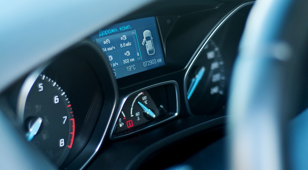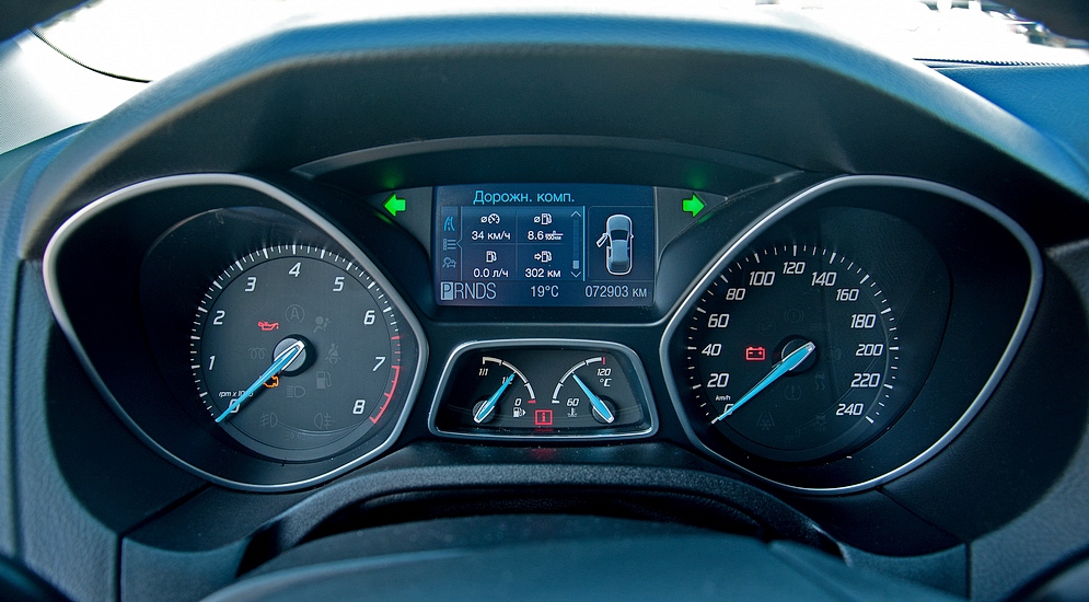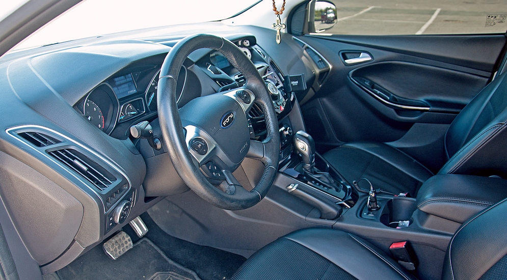 «А как же коробка?» – справедливо могут спросить внимательные граждане. Терпение и спокойствие, сейчас прозвучат слова о фордовском чуде техники PowerShift. Так-так, что-то знакомое: преселективная шестиступенчатая роботизированная коробка передач с двумя «сухими» сцеплениями… Да, конструктивно очень похоже на DSG от Фольксвагена. Звучит красиво, что-то там о непрерывном потоке мощности. Но это всё – поэзия. Проза начинается с рывками и провалами при движении. И кульминацией становится сумма в чеке за ремонт. Замена сцепления, вилок и сальников – от 80 до 100 тысяч. Замена блока управления – около «полтинника». У нашего Форда таких «фокусов» с коробкой не было, и это очень радует. Возникает вопрос: а есть, за что платить? Для этого надо проехать на этом автомобиле. Поэтому садимся за руль. Внутри всё очень и очень симпатично. Дизайнерам удалось найти баланс между стремительностью изгибов и солидностью прямых линий, между дерзостью изогнутого «ручника» и мягкостью материала панели. Сидеть за рулём третьего Фокуса однозначно приятно. Немного не понравились стойки лобового стекла: снаружи они кричат о прелести «кинетического дизайна», а изнутри просто закрывают обзор, при этом настолько, что не всегда видно, во что въедешь на следующем повороте. Двигатель запускаем кнопкой и… ничего не слышим. Если бы не стрелка тахометра, то работу силового агрегата можно вообще не заметить. Очень удачно подобраны усилия на органах управления: руль лёгкий, но не «пустой», а педаль тормоза хотя и имеет небольшой ход, но позволяет точно дозировать усилие. Пришла пора проверить работу коробки. Скажу честно: никаких критических рывков и дёрганий я не заметил, реакция на нажатие педали газа вполне адекватная и достаточно быстрая. Но сам момент переключения всё же чувствуется очень явно, и он неизбежен как при плавном наборе скорости, так и при резвом ускорении. Есть, конечно, коробки и комфортнее, и надёжнее. Хотя и эта пока не ломалась, поэтому будем надеяться на лучшее.Машина провоцирует нарушить правила дорожного движения. Мы этого, конечно же, как обычно, не делали. Но даю слово: характер у машины злой. Особенно радует подвеска, которая хоть и немного «огрызается» на слишком больших неровностях, но трамвайные рельсы позволяет перелетать незаметно, а перестроиться с одного ряда в другой тянет ежеминутно: уж очень хороша её работа во время резких манёвров.