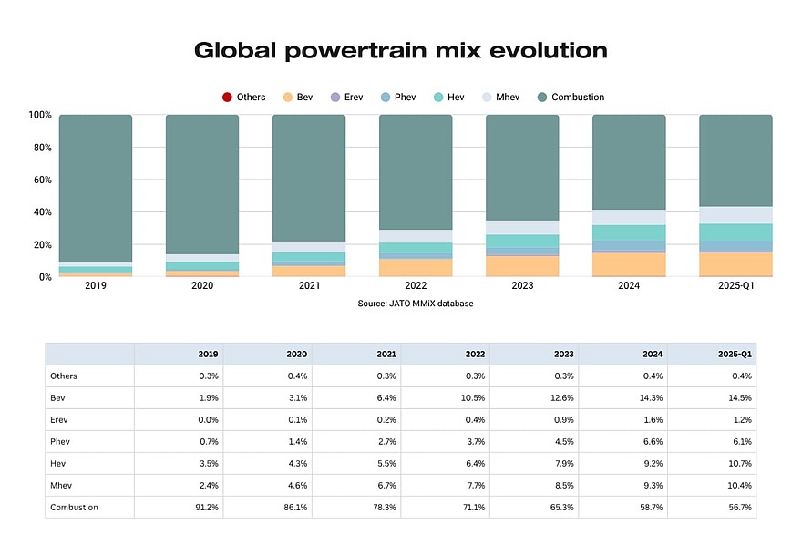 По данным JATO, за последние шесть лет автомобили с ДВС уступили уже треть рынка своим гибридным и электрическим конкурентам. Если в 2019 году 91,2% всех проданных в мире автомобилей были оснащены исключительно двигателями внутреннего сгорания, то в первом квартале 2025 года их набралось немногим больше половины рынка – 56,7%.