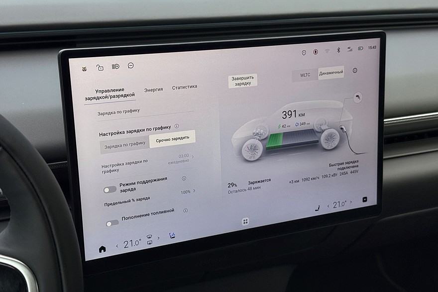 Если продолжить анализ технических данных, то внимание на себя обращают сразу несколько важных опций и функций. Например, электрическая силовая установка позволяет двигаться в «режиме одной педали», недоступном для бензиновых автомобилей. Такой режим возможен благодаря функции максимальной рекуперации, когда при отпускании педали газа моторы начинают заряжать батарею, используя инерцию движения и тем самым тормозя автомобиль. Таким образом, водителю практически не приходится использовать педаль тормоза – можно управлять автомобилем с помощью одной только педали газа, нажимая на тормоз лишь для полной остановки. Помимо очевидного удобства это приносит и другие бонусы: увеличение запаса хода за счет активной рекуперации на каждом торможении и продление ресурса тормозной системы, ведь колодки и диски в таком режиме изнашиваются в разы медленнее. А копейка, как известно, рубль бережет.
