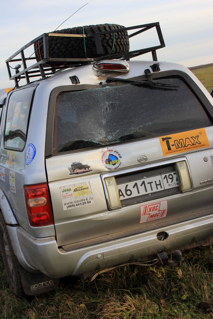 Повреждение автомобиля на трофи-рейде – обычное дело. Из-за длинного заднего свеса Mitsubishi Pajero, мы оторвали накладку. Женский экипаж на Toyota Land Cruiser 200 замял бампер, разбил фару и загнул крепление фаркопа. Больше всего не повезло хозяину Great Wall – он приложился всей кормой к дереву.