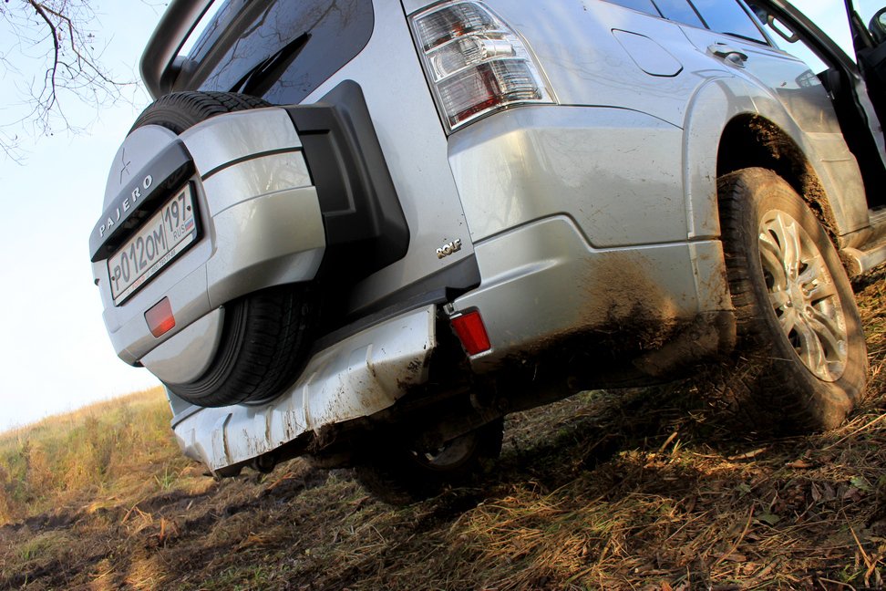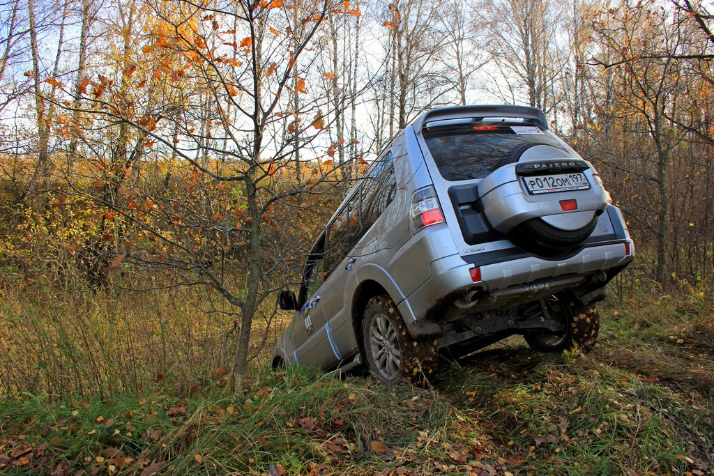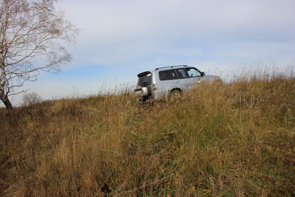 Первый же «чек-поинт» покорился нам без проблем. Преодоление заросшего травой поля с раскисшим грунтом оказалось для Mitsubishi Pajero плёвым делом. Главное – не наскочить на спрятавшийся в траве камень.