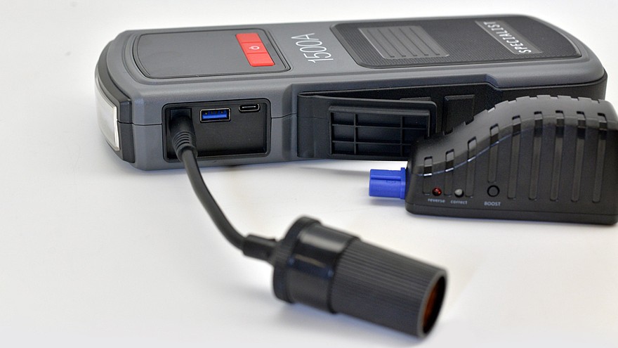У пускового устройства имеется два USB-выхода (обычный и мощный QC), гнездо Type-C, работающее в обе стороны – и для заряда самого «бустера», и как выходное, а также выход 14,8 вольт 10 ампер для различных 12-вольтовых автоаксессуаров. «Крокодилы» для подключения к автомобилю оснащены полным комплексом защит: от перегрузки и короткого замыкания, от перегрева аккумулятора, перезаряда, обратной полярности, перенапряжения. Отдельный разговор – конструкция «крокодилов»: если у большинства «пускачей» (включая всех участников этого рейтинга) они пластиковые с металлическими зубчатыми вставками, то у PRO-60 «крокодилы» полностью металлические, в том числе в области шарнира. Пластиковые морозостойкие накладки на них только защищают их сверху от соприкосновения и обозначают цветом полярность. Такая конструкция не становится хрупкой на холоде, даже если хранить «крокодилы» зимой в бардачке (унося сам бустер в тепло, разумеется).