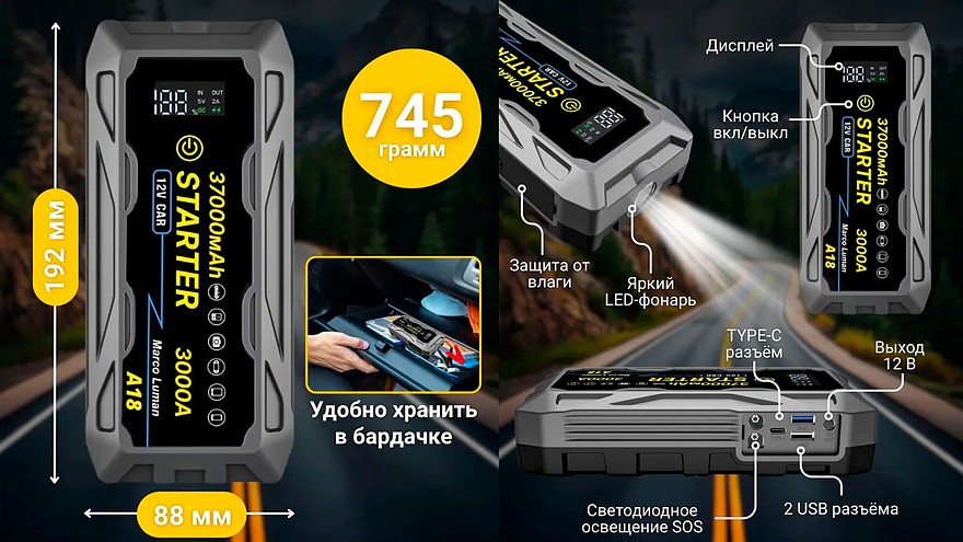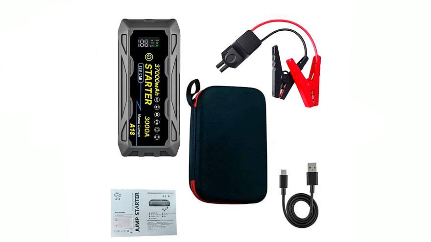 Это пусковое устройство попало в наш рейтинг, поскольку является популярной моделью на маркетплейсах и по своим габаритам идеально вписывается в формат большинства «25-тысячников». А заявлены в нем и вовсе 37 тысяч миллиампер-часов и 3000 ампер выходного тока при 4-ячеечной батарее. Неужели под конец возник внезапный лидер рейтинга, который поменяется местами с первым, учитывая еще вдобавок и то, что и продают его почти задаром?