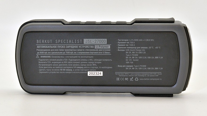 Вплотную к лидеру подобралась старшая модель из линейки BERKUT — JSL-27000. Несмотря на цифры «27000» в индексе, емкость аккумулятора у этого «пускача» составляет не 25 000 миллиампер-часов, а чуть меньше – 24000, но это также честные цифры, как и у PRO-60.