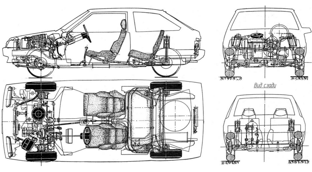Проект платформы, получивший условное название "Гамма-1", довольно типичен по компоновке для автомобилей С-класса восьмидесятых годов: поперечное расположение силового агрегата, передняя подвеска типа Макферсон, реечное рулевое управление, закрепленное на моторном щите, П-образная балка сзади, плоский бак под задним сидением – вот, пожалуй, главные отличительные черты вазовской платформы. В отличие от современных переднеприводников, Спутник оказался лишен переднего подрамника – вместо него в подвеске предусмотрели поперечные рычаги и продольную растяжку.