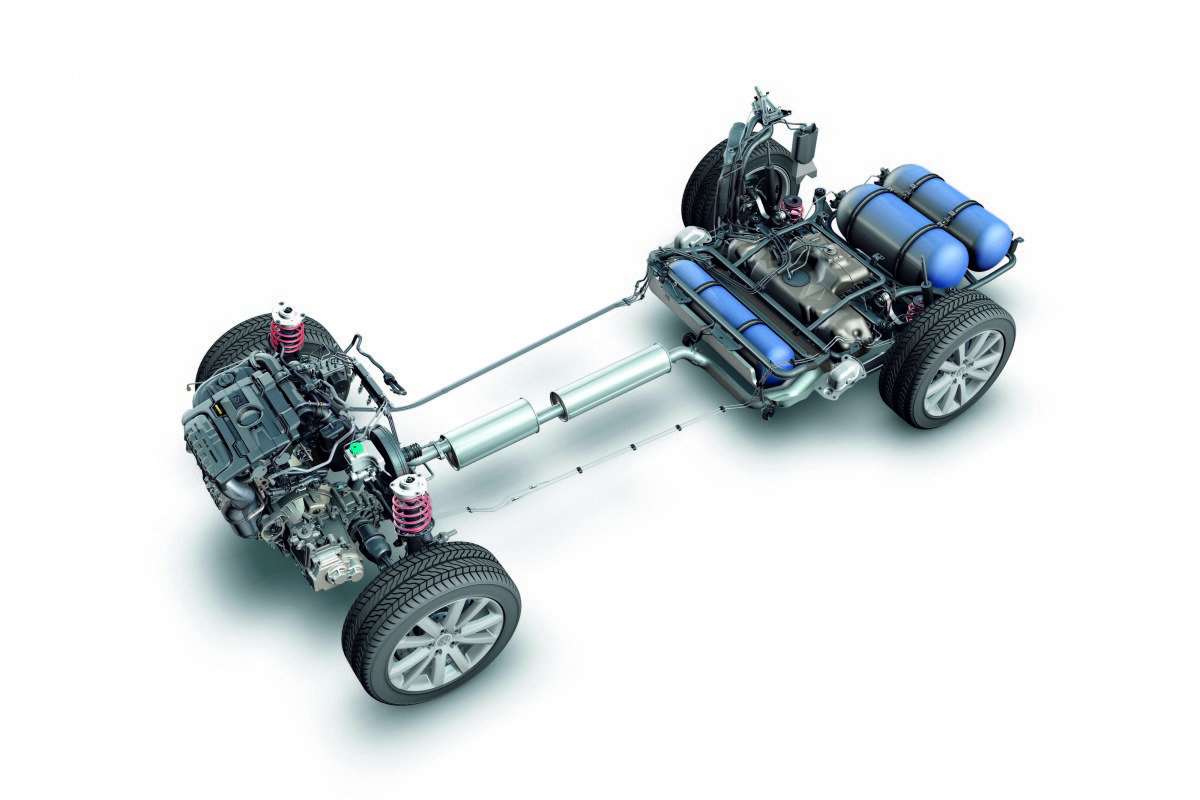 Схема шасси Volkswagen Passat EcoFuel. Хорошо видна компоновка «гибридной» (газ + бензин) топливной системы: вокруг задней оси расположены 31-литровый бензобак и три газовых баллона, вмещающих в общей сложности 21 кг сжатого природного газа.