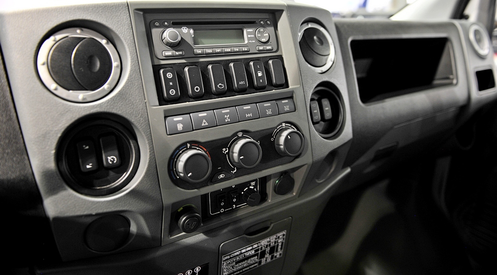 Водительское кресло с пневмоподвеской, руль регулируется по углу наклона, щиток приборов такой же, как и в ГАЗели. Заметные отличия — в массивном рычаге механической КПП и ряде клавиш на центральной панели, заведующих приводами блокировок дифференциалов, подключением переднего моста и понижающей передачи.
