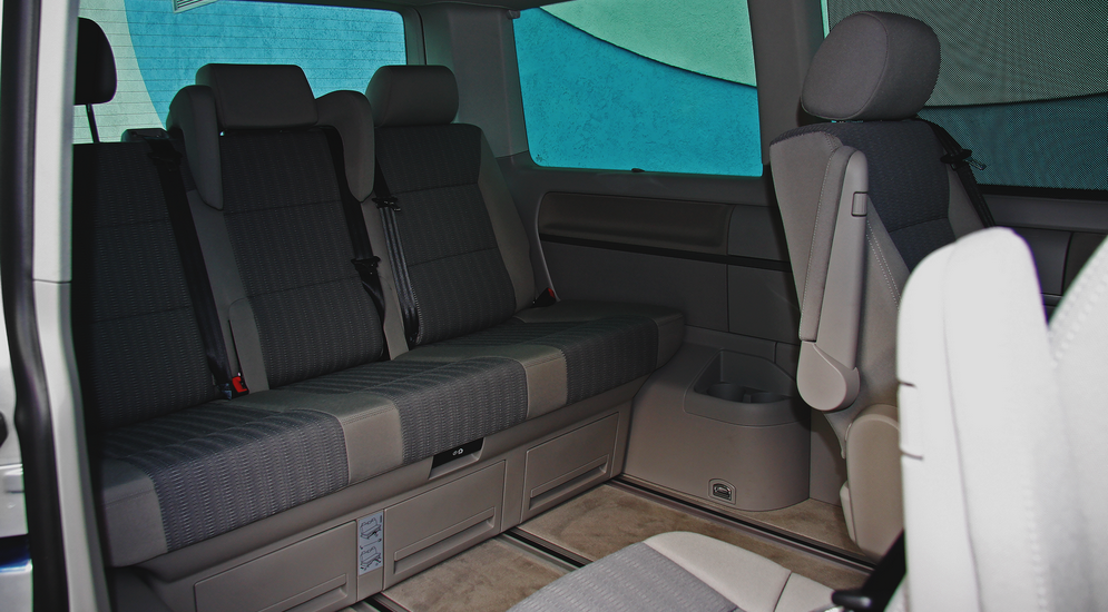Подъемная задняя дверь открывает доступ в багажник, задний пассажирский диван может двигаться по направляющим в очень большом диапазоне. Интересно, что для того, чтобы его сдвинуть, достаточно дернуть за ремень и просто толкнуть или потянуть – больших усилий не требуется. При желании все сиденья салона можно снять полностью, и тогда получим грузовое пространство в 4,5 м³. Средние сиденья могут не только двигаться вперед-назад, но и разворачиваться на 180˚, в таком случае салон превращается в удобное купе для переговоров или ланча. К сожалению, диван не раскладывается в плоскость, и выспаться в дороге не получится.