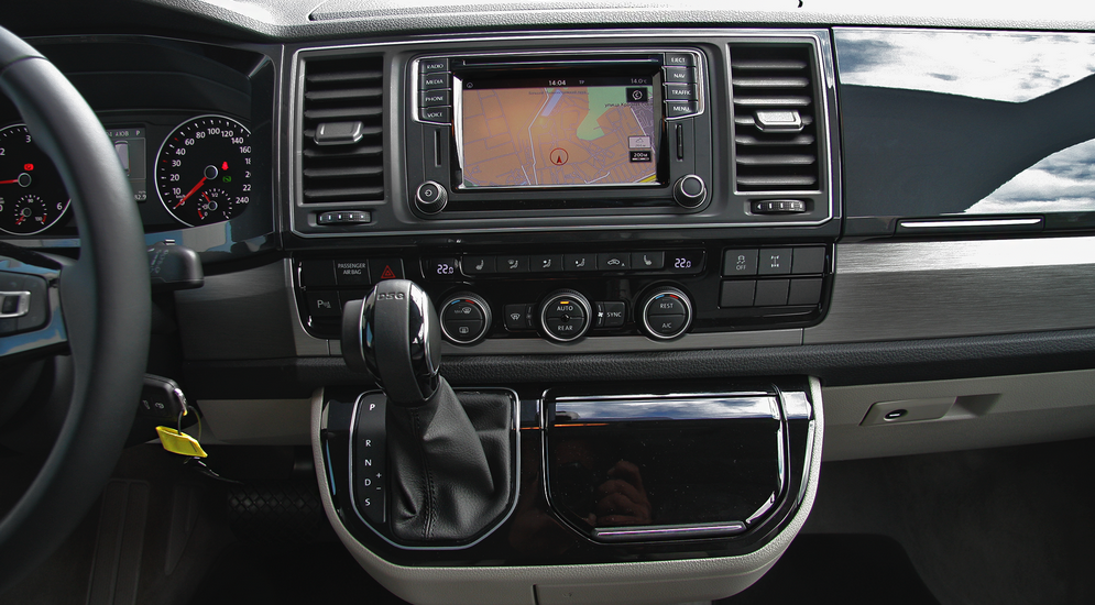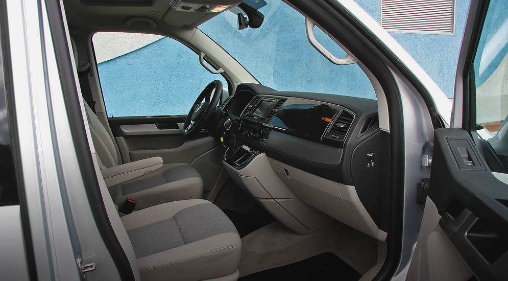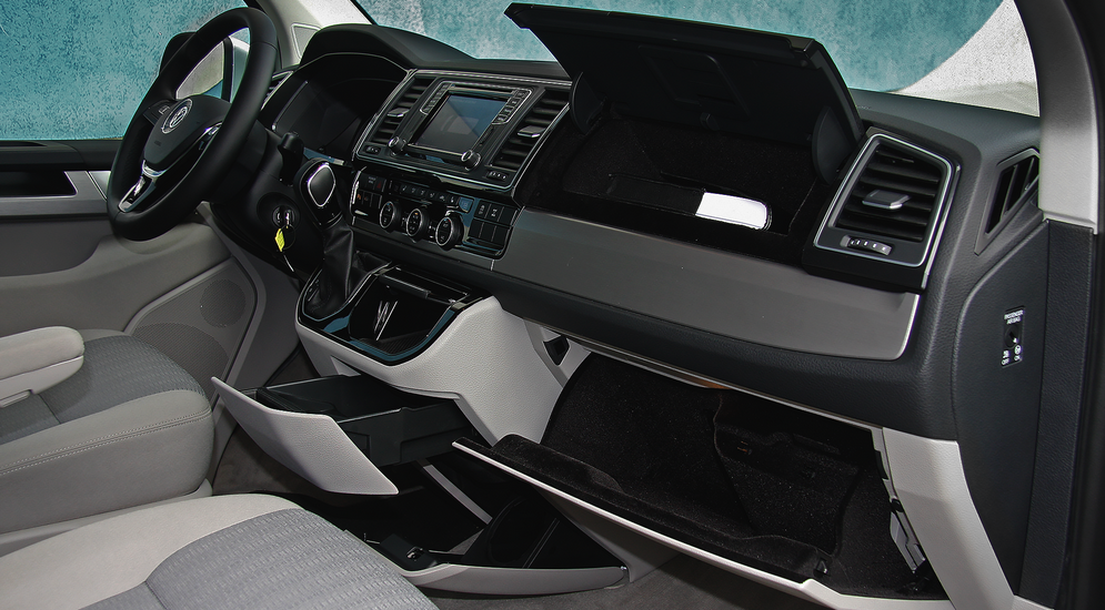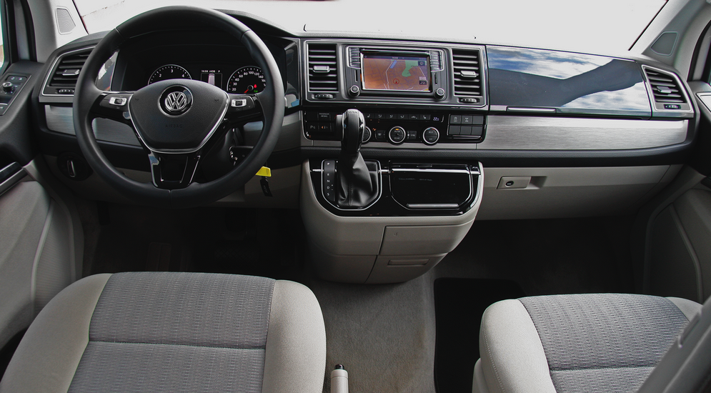 Водительское пространство… Да, именно так – пространство. Визуальными методами пространство расширили, и создается впечатление, что в новом Т6 гораздо больше места, чем в Т5, но это иллюзия, которую обеспечивают опущенная линия остекления и светлые тона обивки.