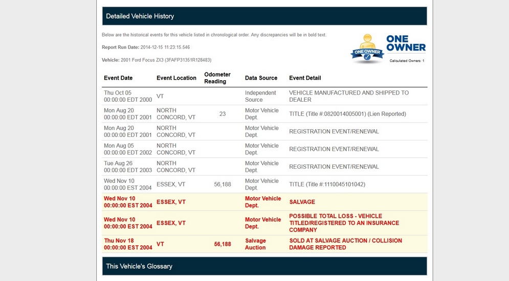 Итак, в качестве подопытного мы взяли старый Ford Focus 2000 года, который я купил по большой глупости несколько лет назад. Он был безнадежно гнилой, и впоследствии я его продал за 80 000 рублей одному своему приятелю "с руками" и большим количеством свободного времени. Что нам расскажут о нем американские сервисы?Проверка в Carfax