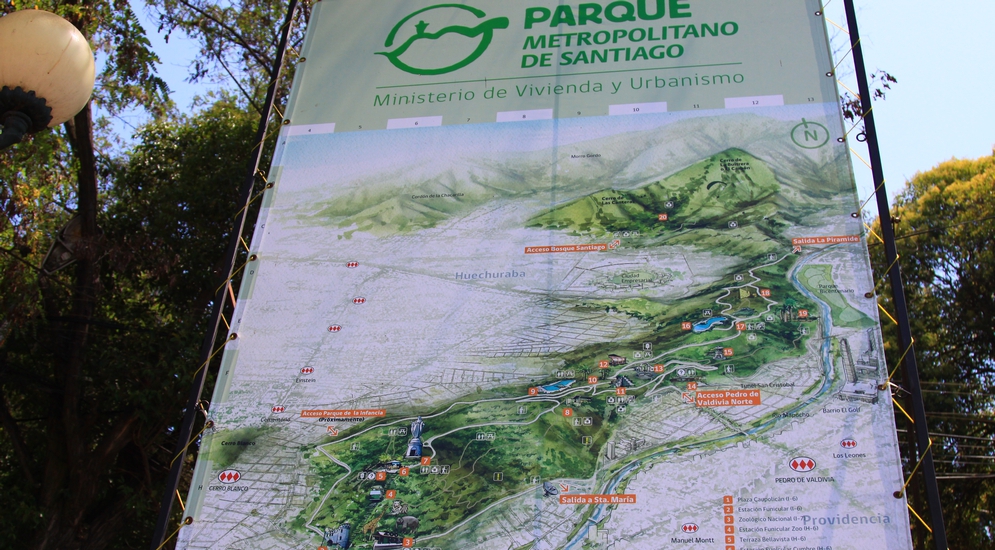Сантьяго имеет весьма специфичное географическое положение – у подножия Анд, на берегах речки Мапочо в замкнутой котловине. С востока столицу окружают горные хребты Анд, на западе она граничит с Прибрежной Кордильерой. Самые красивые виды на Сантьяго, несомненно, открываются с холма Святого Кристобаля, который находится на некотором отдалении от центра. Жители Сантьяго иногда называют этот холм «легкими города». Чтобы добраться туда, на высоту 860 метров, жители и туристы пользуются фуникулерами. Добравшись до верха, оказываешься в самом настоящем лесу, откуда в хорошую погоду открывается великолепный вид на окрестности и горные хребты Анд.