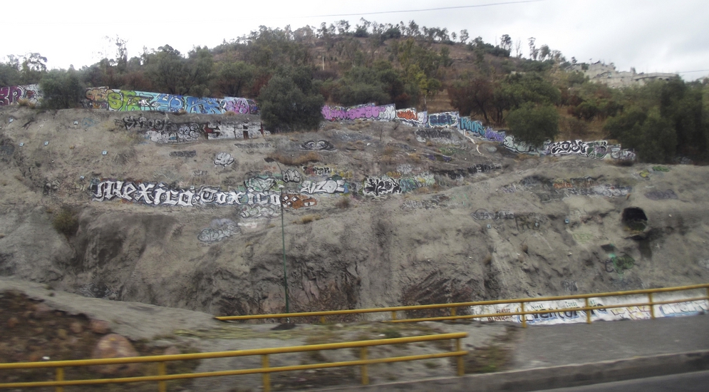 Выйдя из метро, мы отыскали отправной пункт пригородных автобусов. Преодолев часть пути, местные жестами убедили нас сделать пересадку. Остановка представляла собой странное, пыльное, неблагоустроенное место на обочине трассы, обнесенное сеткой-рабицей, на котором, сформировав подобие очереди, уже стояла группа людей, почему-то вызывающая ассоциации с нелегальным переходом границы где-нибудь в Тихуане. Примерно через тридцать минут прибыл нужный автобус, и мы продолжили путь вдоль гор, домов и оград, испещренных граффити с названиями местных криминальных банд и прочей ерундой.