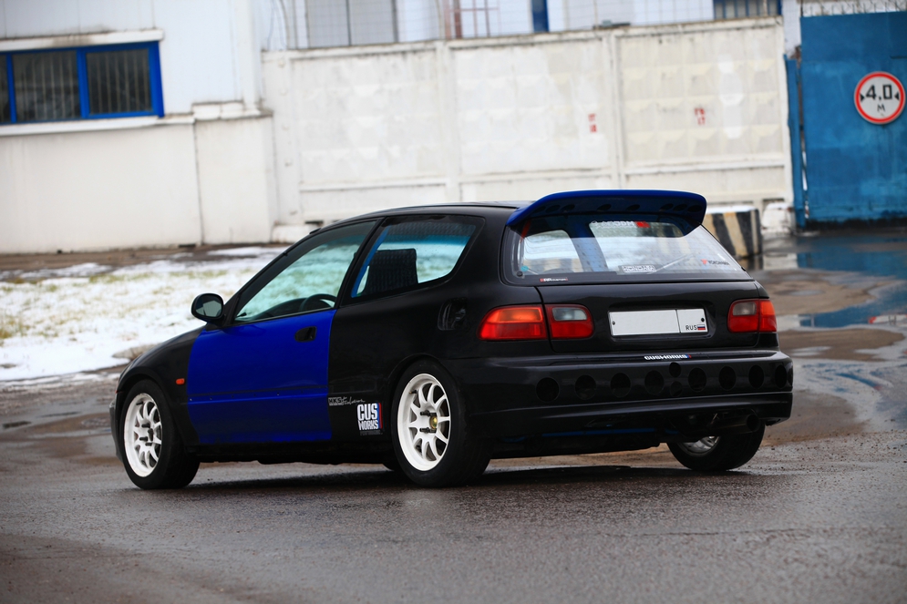 Поскольку со сторонними малярами Сергей больше иметь дел не собирался, он стал сам себе маляром, снова перекрасил подкапотку и салон (с целью построить машину еще более качественно) и начал все собирать обратно по уму, с учетом накопленного опыта. В очередной раз решил заменить сердце своего EG5, выбрав мотор B16B от Honda Civic EG9, так как он крутится выше и уже в заводском варианте лучше подходит для кольца. К мотору купил коробку передач от Honda Integra Type R Spec 98 с главной парой 4,7, громкий выхлоп Buddy Club R Spec, алюминиевый радиатор и разные другие полезные вещи (заднюю распорку жесткости x-бар, керамические колодки, руль и ковш). В подвеске были установлены новые стойки Tein, пружины Ohlins и стабилизаторы от Honda Integra Type R Spec 96, более жесткие относительно стоковых. И еще Сергей немного облегчил кузов: удалил ручной тормоз, нишу для запаски, задние кронштейны сиденья и домкрата, лишние кронштейны в подкапотке и тяжелый люк, вместо которого теперь красуется пластиковая заглушка. Капот, крылья и крышку багажника заменил на пластиковые.