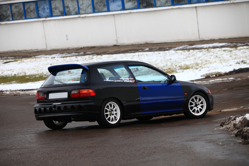 После настройки Хонды на диностенде состоялся первый пробный выезд на кольцевую трассу в Мячково. Он наглядно дал понять, что мешает автомобилю на треке и в чем он нуждается. Минусов выявилось немало: не было блокировки в коробке передач (при прохождении поворотов и выходе из них одно колесо теряло сцепление с асфальтом и срывалось в букс, что не позволяло реализовывать мощность двигателя и негативно сказывалось на предсказуемости поведения автомобиля), резина была неважнецкой («держак» на кольце играет одну из главных ролей), а задние тормоза были слишком мощными (при езде по городу тормоза с диском 262 мм играли положительную роль, на кольце же на Сивике с его легкой задней частью задние колеса блокировало, они перетормаживали, вследствие чего терялся контроль над авто). Поэтому в преддверии зимы машина снова была полностью разобрана.