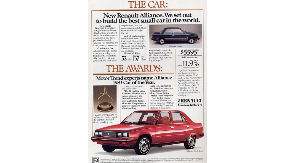 Активное продвижение марки Renault на рынке США началось после заключения соглашения с American Motors Corporation (AMC), контрольный пакет акций которой Renault приобрела в 1980 году, заодно получив в собственность и марку Jeep. «Девятка», которую собирали в Америке, даже получила собственное название Alliance и стала автомобилем года в США. Но и это еще не все – Альянсу даже удалось стать автомобилем… агента 007! В нескольких сюжетах очередного фильма про Джеймса Бонда суперагент ездит именно на «французско-американской» машине.