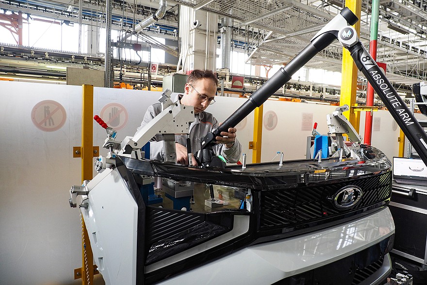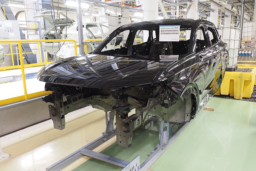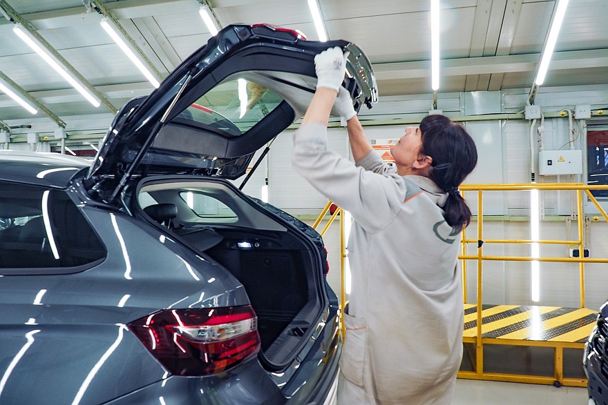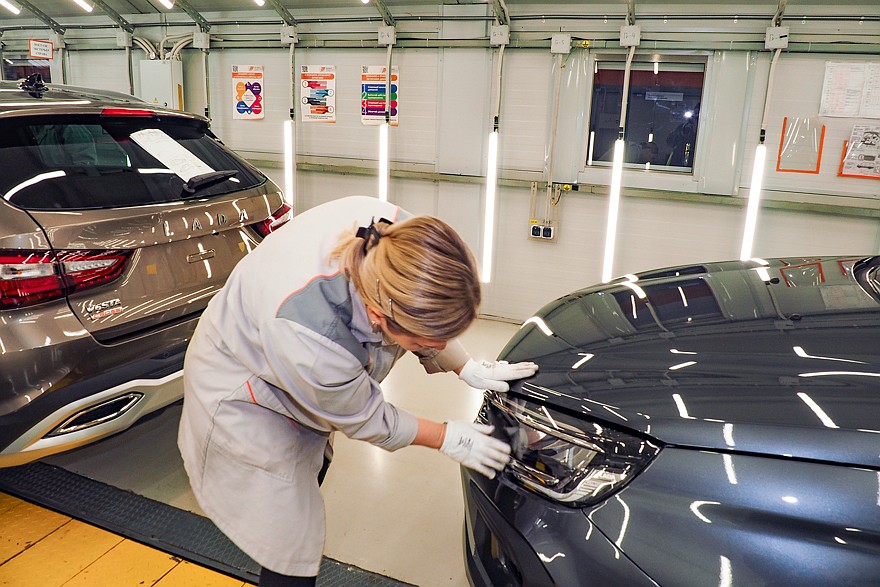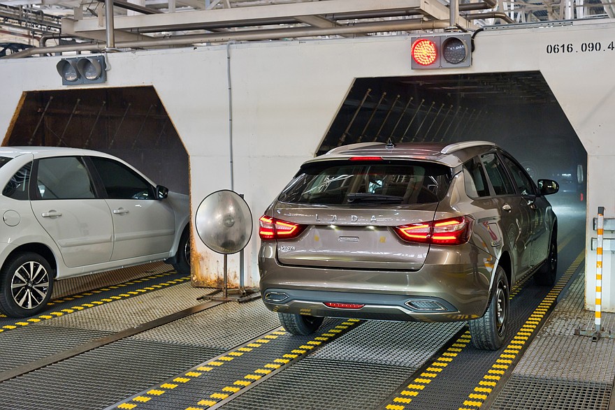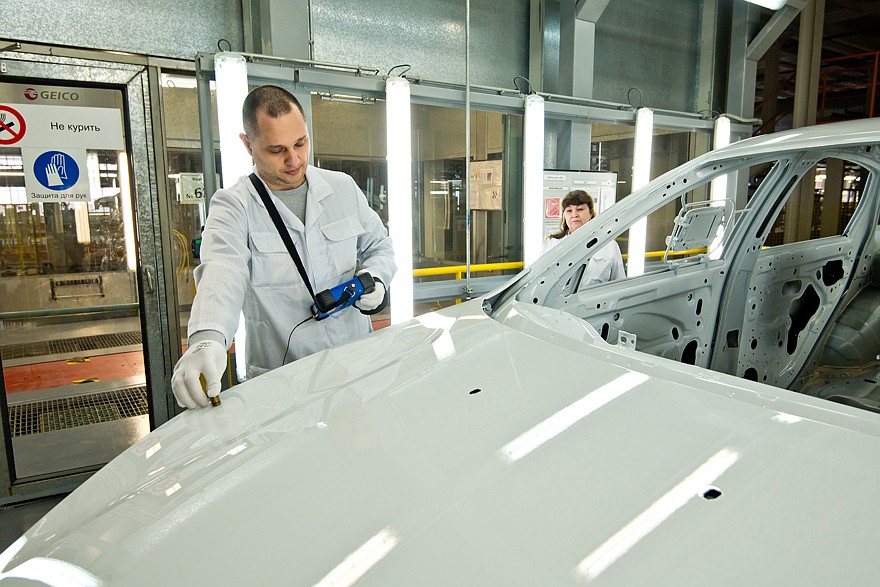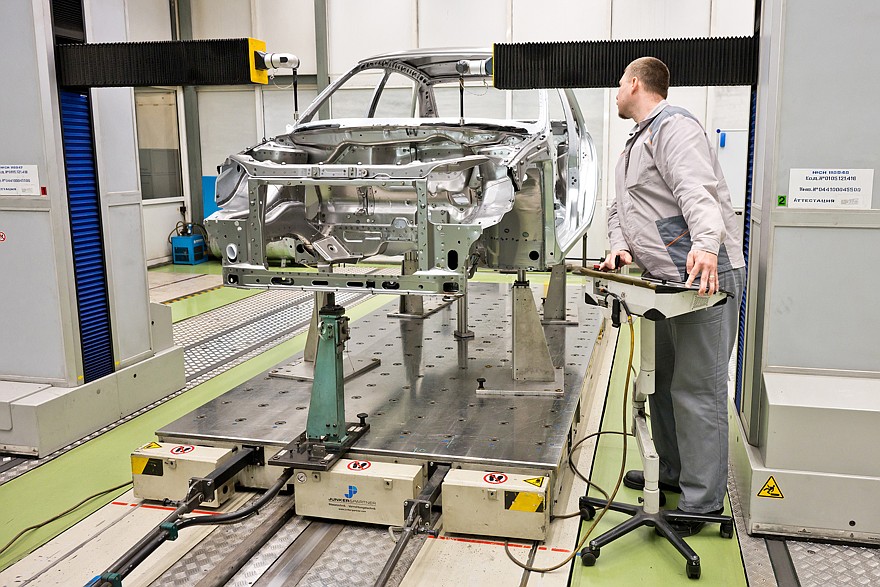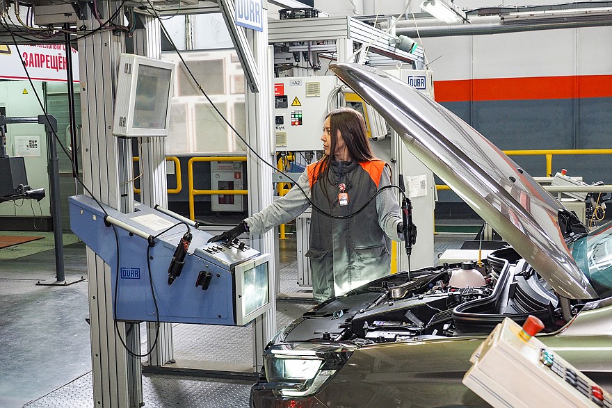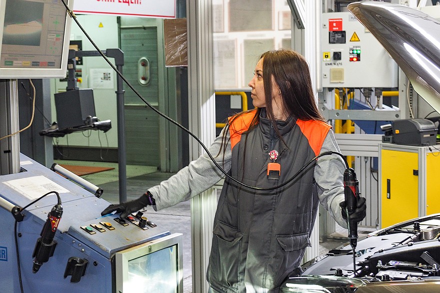 После сборки автомобили поступают на углубленный контроль. В обязательном порядке каждый собранный экземпляр проходит через специальный стенд, на котором измеряются параметр вакуума, а также – уровни заправки технологическими жидкостями тормозной системы, системы охлаждения двигателя и системы кондиционирования. На следующем стенде проверяются углы установки колес и света фар. Следующий этап – испытание автомобиля на роликовых стендах и на тормозных барабанах. Ну и, наконец, осмотр готового автомобиля в световом туннеле с контролем зазоров и перепадов, правильности установки уплотнителей, усилия закрывания дверей. Контролеры осматривают моторный отсек и подвеску на эстакаде, а затем на специальном стенде проверяется работа светотехники. Пока что это выглядит так: сотрудник по очереди включает тот или иной осветительный прибор и видит на экране, загорелись или нет габариты, фары ближнего и дальнего света, поворотники, стоп-сигналы, работает ли подсветка номера, и делает соответствующую отметку. Но в ближайшее время оценка «работает – не работает» будет выставляться автоматически, при помощи машинного зрения.