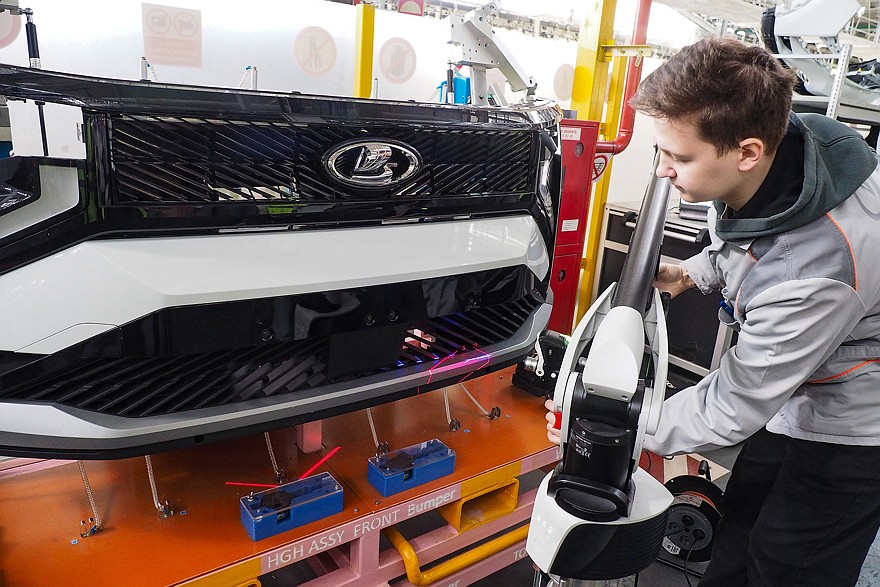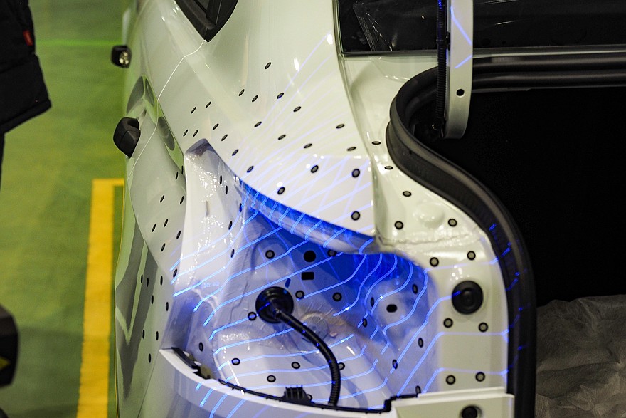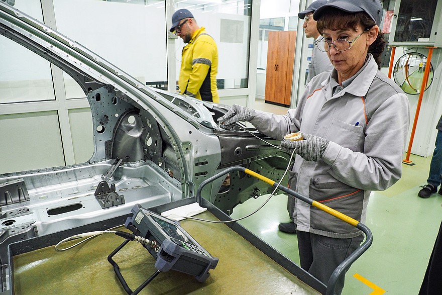 Еще одним важным элементом является неразрушающий контроль качества точек сварки при помощи ультразвука. Каждый кузов Lada Granta и Iskra имеют порядка 4800 точек сварки, а в кузовах Vesta их более пяти с половиной тысяч. И на каждую точку нужно поместить ультразвуковой преобразователь, который состоит из генератора ультразвуковых волн и датчиков, которые принимают их отражение. Результаты выводятся на дисплей, и контролер может увидеть и так называемый «непровар», и «пережог».