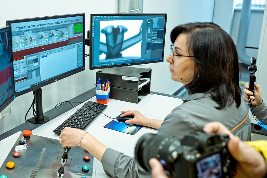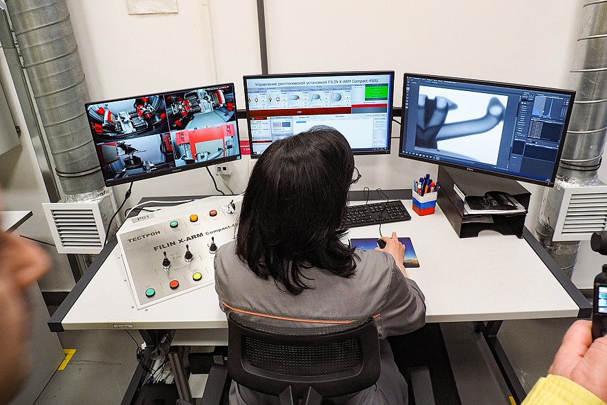 Массивные изделия тоже проходят через неразрушающий контроль, но тут ультразвук не поможет – только рентген. На заводе смонтированы семь мощнейших рентгеновских установок. Они в десятки раз мощнее медицинских, поэтому располагаются в специальных защитных боксах и изготовлены отечественными компаниями. Сидящий в «рентгеновском кабинете» оператор дистанционно управляет и работой установки, и позиционированием исследуемой детали. И это тоже требует высочайшей квалификации.
