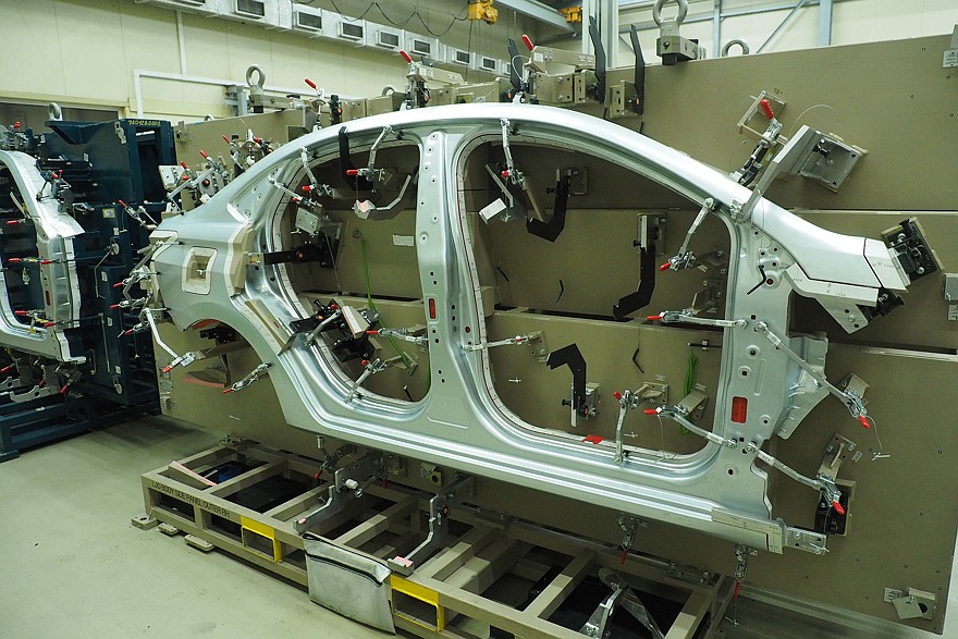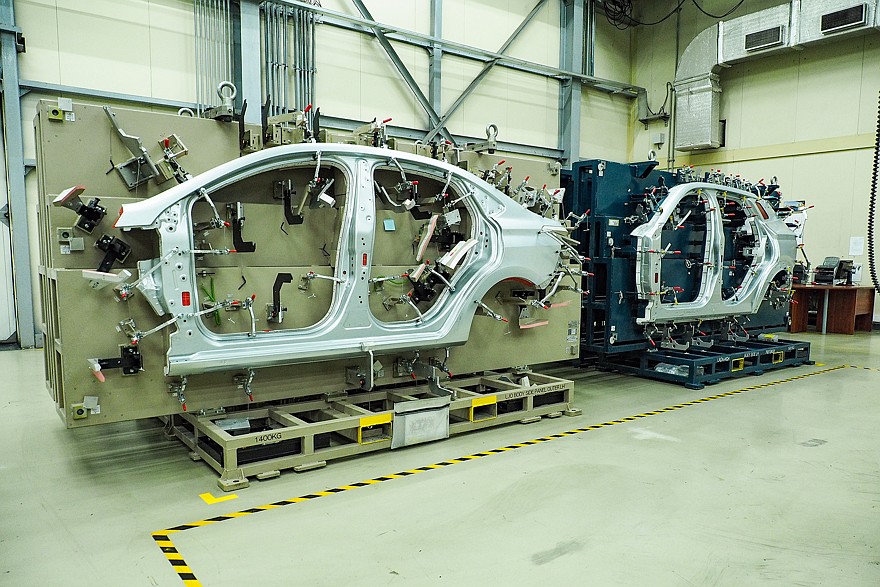 В инженерии калибр – это специализированный контрольно-измерительный инструмент, предназначенный для проверки соответствия геометрических параметров деталей установленным требованиям чертежа. Основная задача калибра – не измерять точное значение размера, а определить, находится ли контролируемый параметр в пределах допустимого диапазона. Так об этом пишут в энциклопедиях. И в системе контроля качества кузовных деталей, выходящих из-под прессов и поступающих на участок сварки, калибры занимают ключевое место. Выглядит все это так: при помощи струбцин деталь закрепляется на калибре, который в свою очередь, установлен на массивной раме. Вся эта конструкция монтируется на еще более массивную чугунную станину роботизированного измерительного комплекса. Рука с измерительной головкой проходит по заранее заданным точкам, и результаты измерений, точность которых составляет сотые доли миллиметра, сопоставляется с математической моделью детали. Кузов автомобиля сваривается из множества деталей (например, кузов Lada Vesta – из 245). Для каждой из них готовится отдельный калибр, который хранится на специальном складе. Ну а чтобы избежать путаницы, рамы, на которые установлены калибры деталей разных моделей, окрашены в отдельные цвета.
