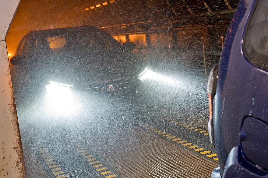 Еще один этап – проливка автомобиля в дождевом тоннеле. Заехала машина, получила свою порцию интенсивного орошения, а за этим следует проверка: в салон не должно просочиться ни одной капли.