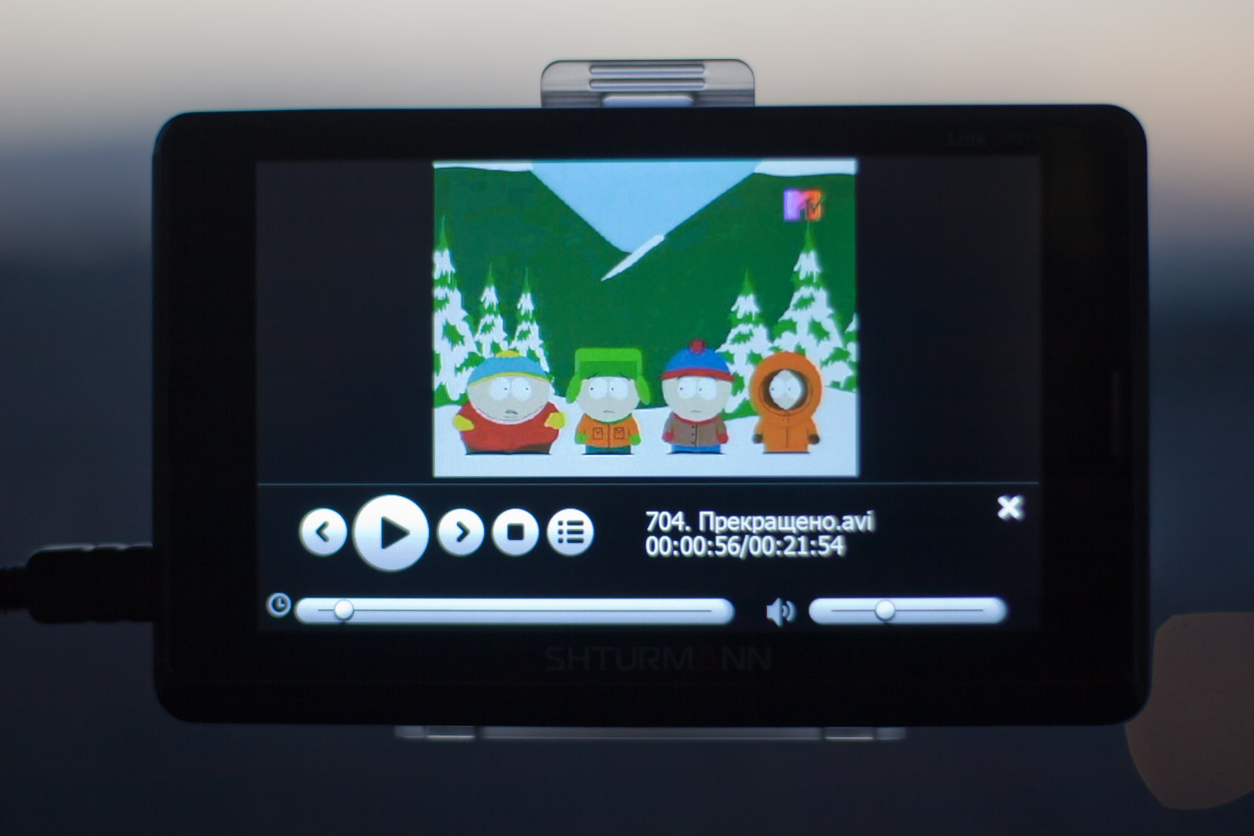 Большой пятидюймовый экран с хорошим разрешением буквально провоцирует к использованию мультимедийных функций, а особенно видео. Замечу, что очень многие используют этот функционал у навигаторов в качестве средства скоротать время при всяких нудных стоянках — тех же пограничных переходах, ожиданиях у магазинов, сервисов и пр. Также немало тех, кто таким образом развлекает детей во время дальней дороги — накачал мультиков и дал на заднее сиденье смотреть.