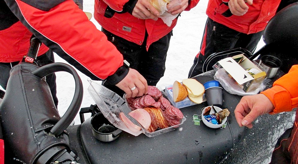 И да. Горячий обед, шампанское и фуа-гра в лес на оленях не приводят. Задубевшая на морозе колбаса, сыр, сало, хлеб и чай из термоса. Это, кстати, отлично иллюстрирует и общий фон «продажности» мотожурналистов. Конечно, за краюху хлеба и кусок замерзшей колбасы мы все дружно «облизываем» производителей, ведь именно этим они нас и купили.