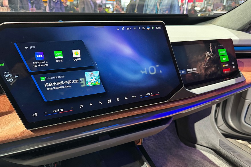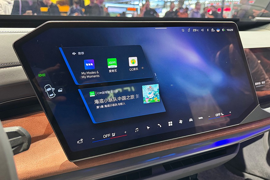 А вот интерьер «семёрки» изменился куда более существенно: теперь здесь довольно хаотичное нагромождение нарочито косоугольных экранов. По китайской традиции экранов теперь два: центральный, для управления мультимедийной системой и всеми функциями автомобиля, а также пассажирский, чисто для развлечения. В общем-то, примерно то же самое мы уже видели на концептах семейства Neue Klasse, а теперь эти причудливые решения уже вовсю шагают по модельному ряду.