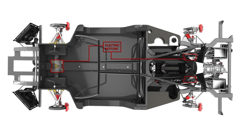 Под обтекателем разместился 6,2-литровый двигатель V8, знакомый нам по модели Chevrolet Corvette ZR1. Полностью выполненная из алюминиевых сплавов «восьмерка», снабженная механическим компрессором Eaton, весит всего 120 кг и выдает на-гора 912 л.с. и 1 200 Нм крутящего момента. В содружестве с американским мотором работают сразу четыре электромотора, которые развивают по 300 л.с. (220 кВт) каждый и приводят в движение каждый по одному из колес суперкара. В результате суммарная отдача гибридной силовой установки, названной создателем Warp Drive System, достигает безумных 2 108 л.с. и 2 280 Нм крутящего момента.
